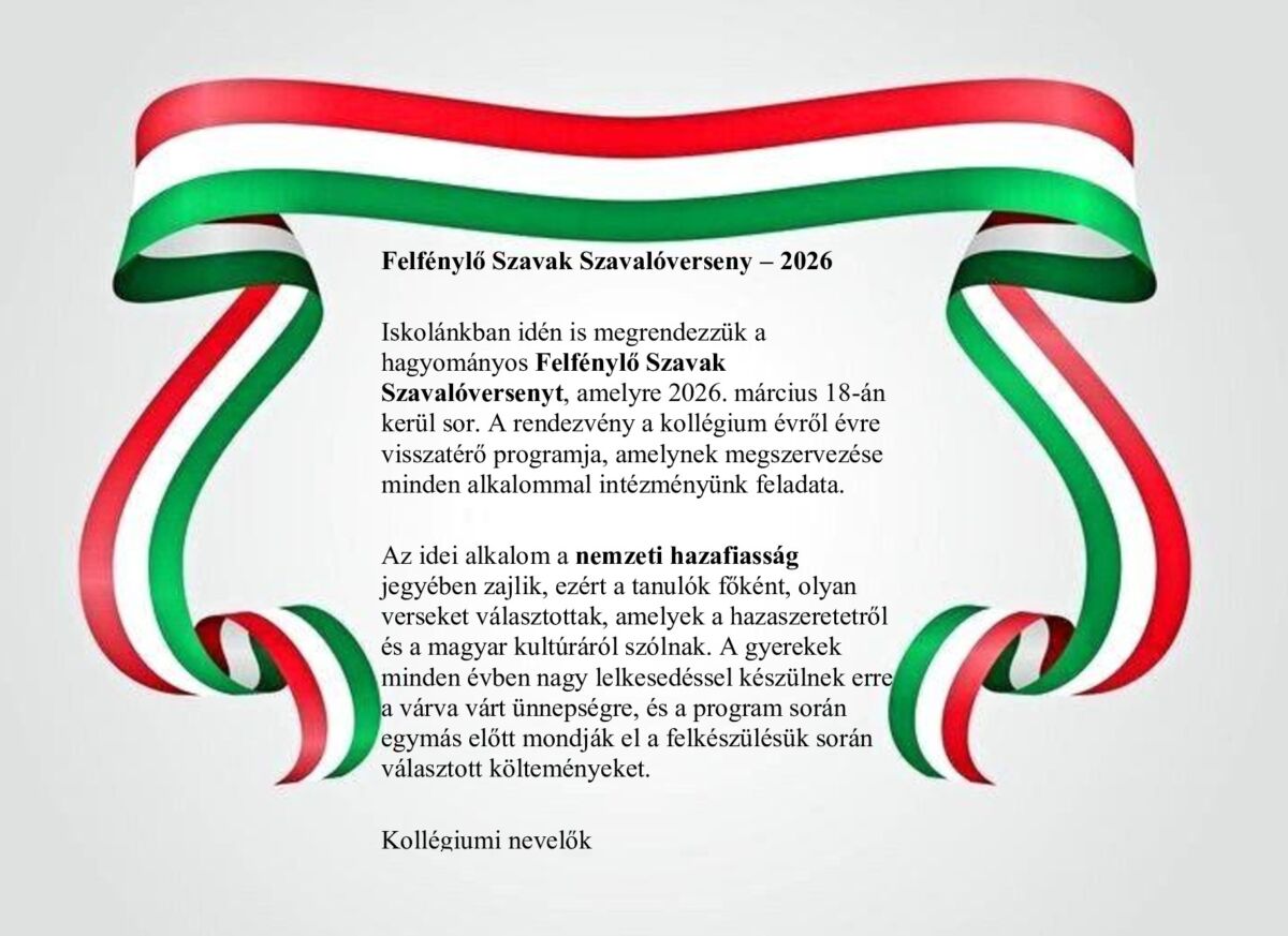 Iskolánkban idén is megrendezzük a hagyományos Felfénylő Szavak Szavalóversenyt, amelyre 2026. március 18-án kerül sor.