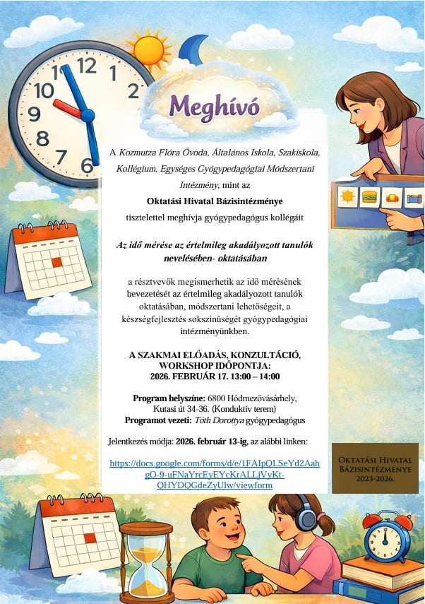 A Kozmutza Flóra Óvoda, Általános Iskola, Szakiskola, Kollégium, Egységes Gyógypedagógiai Módszertani Intézmény, mint az Oktatási Hivatal Bázisintézménye, tisztelettel meghívja a gyógypedagógus kollégákat „Az idő mérése az értelmileg akadályozott tanulók nevelésében-oktatásában” című szakmai programjára.